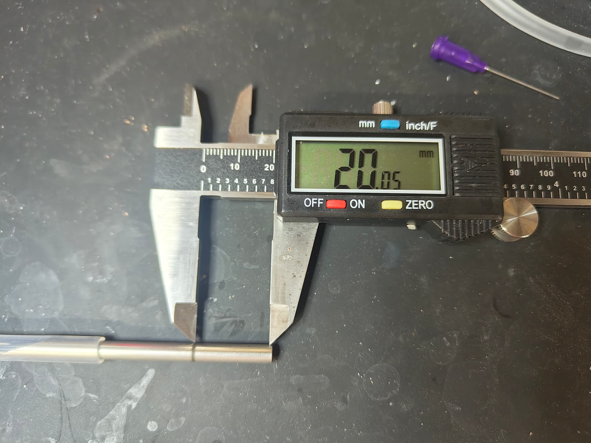 The plunger in my STL is 4.25mm diameter. My (shitty) calipers say the needle ID is 4.3 and the needle OD is 4.9mm. The printed injection body should allow for 20mm of the needle (the part behind the laser etched mark) to seat and be glued into the body.